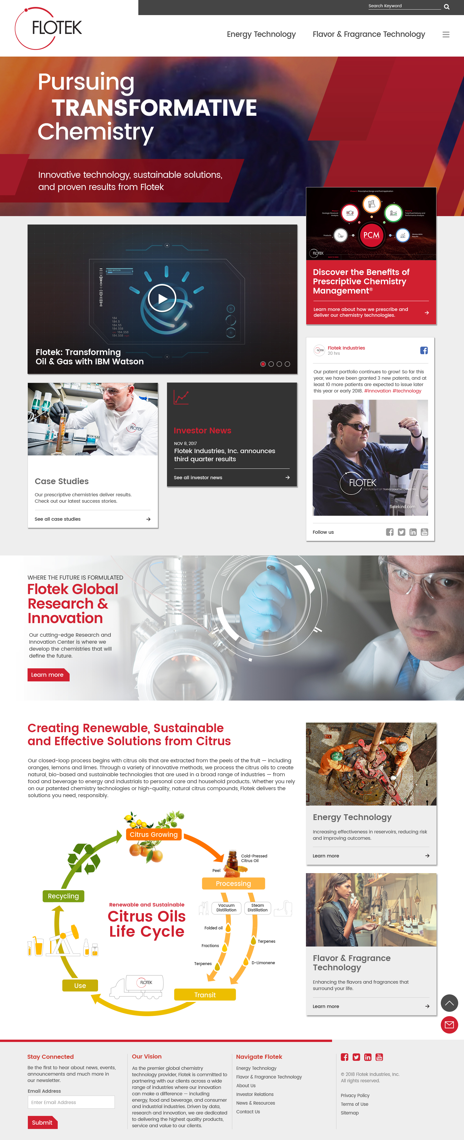 Flotek is a unique oilfield chemistry company, providing one-of-a-kind and citrus-based solutions for maximizing recovery in the oilfield in a cleaner, more sustainable manner. These chemistries may cost more, but they provide greater value to customers — and our planet. This message is conveyed across a series of rebranding deliverables, including an interactive experience, videos highlighting their value and integration of IBM Watson, and a yet-to-launch website refresh.